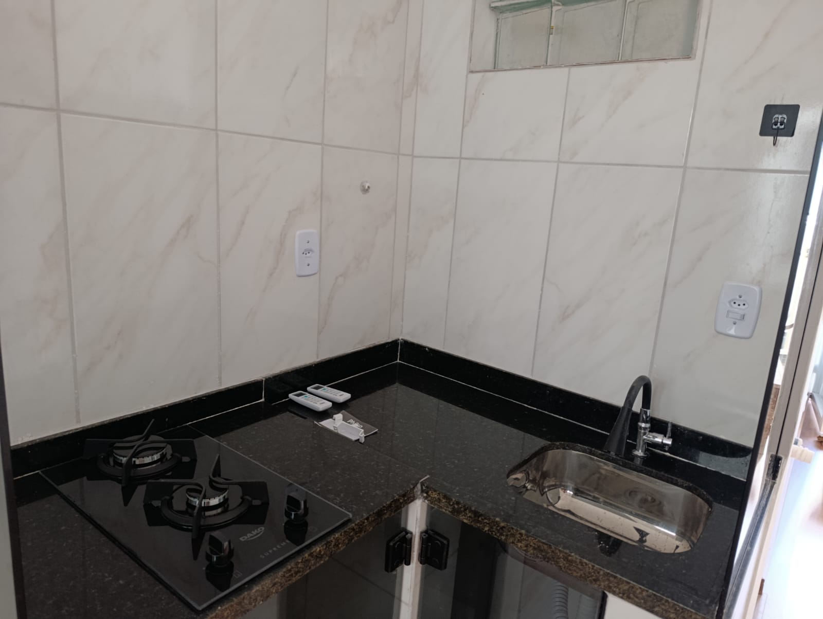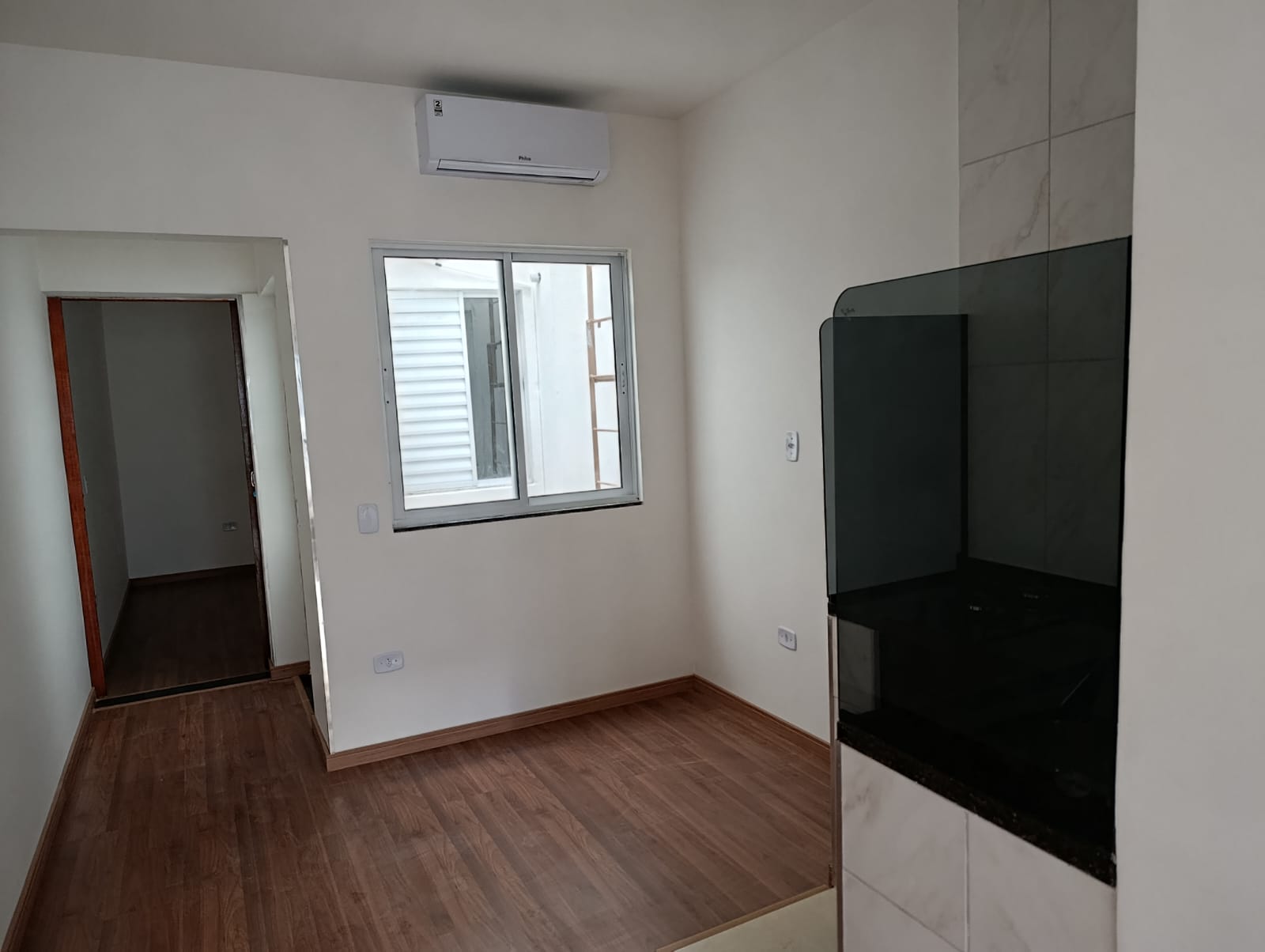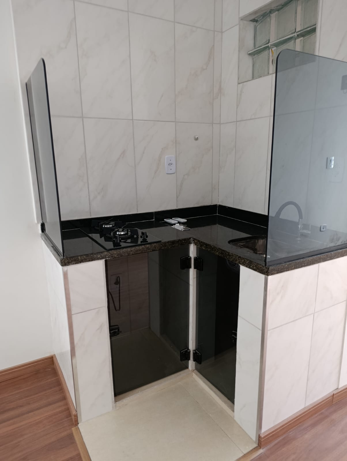 Sala principal ampla integrada à copa com gabinete e cooktop de 2 bocas